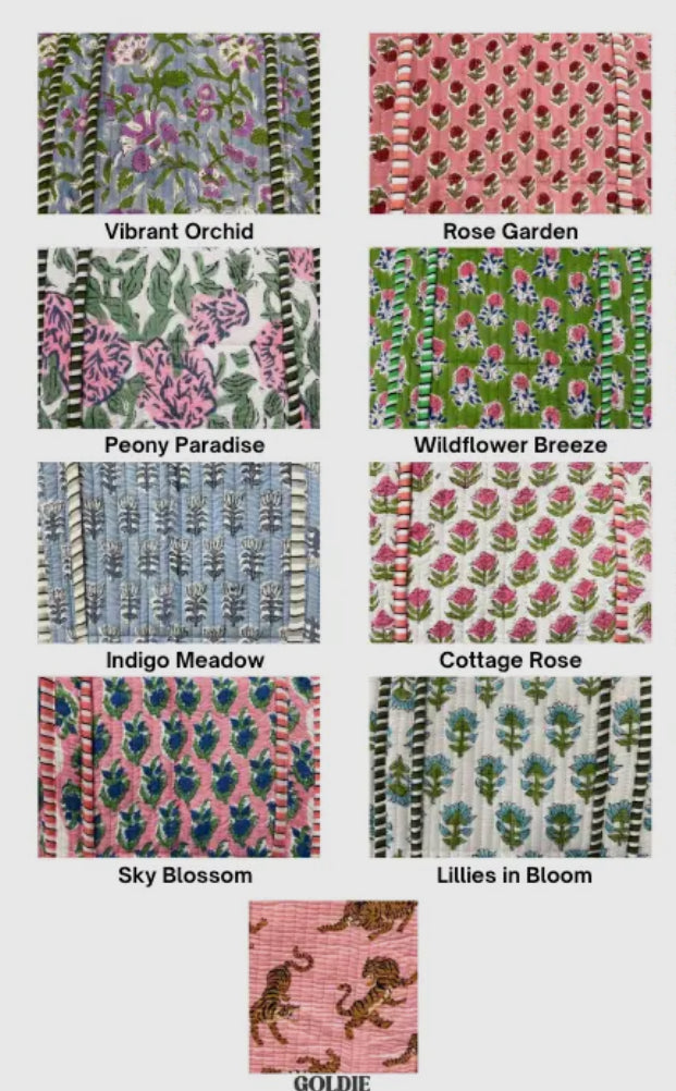 Quilted makeup bags now available in eight prints! Matching tote and duffel bag available to make it a full set Elevate your spring and summer style with this new arrival Monogrammed included. Note the color of the bag and name/initials for each bag in cart instructions.